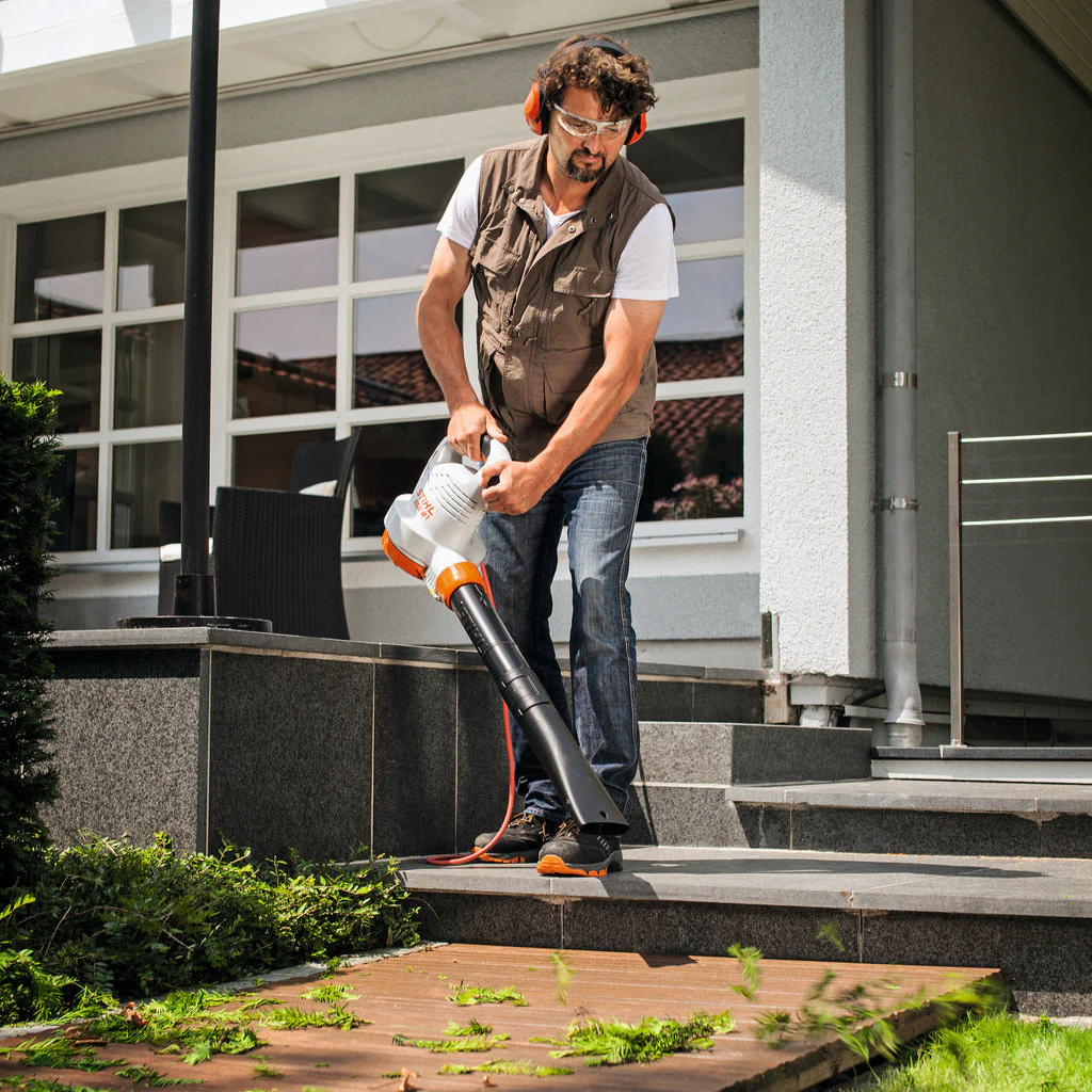 Der elektrische Stihl-Laubbläser kann wahlweise rechts oder links getragen werden. Komfort und Sicherheit sind sehr wichtig, daher empfehlen wir bei häufigem Gebrauch Gehörschutz: